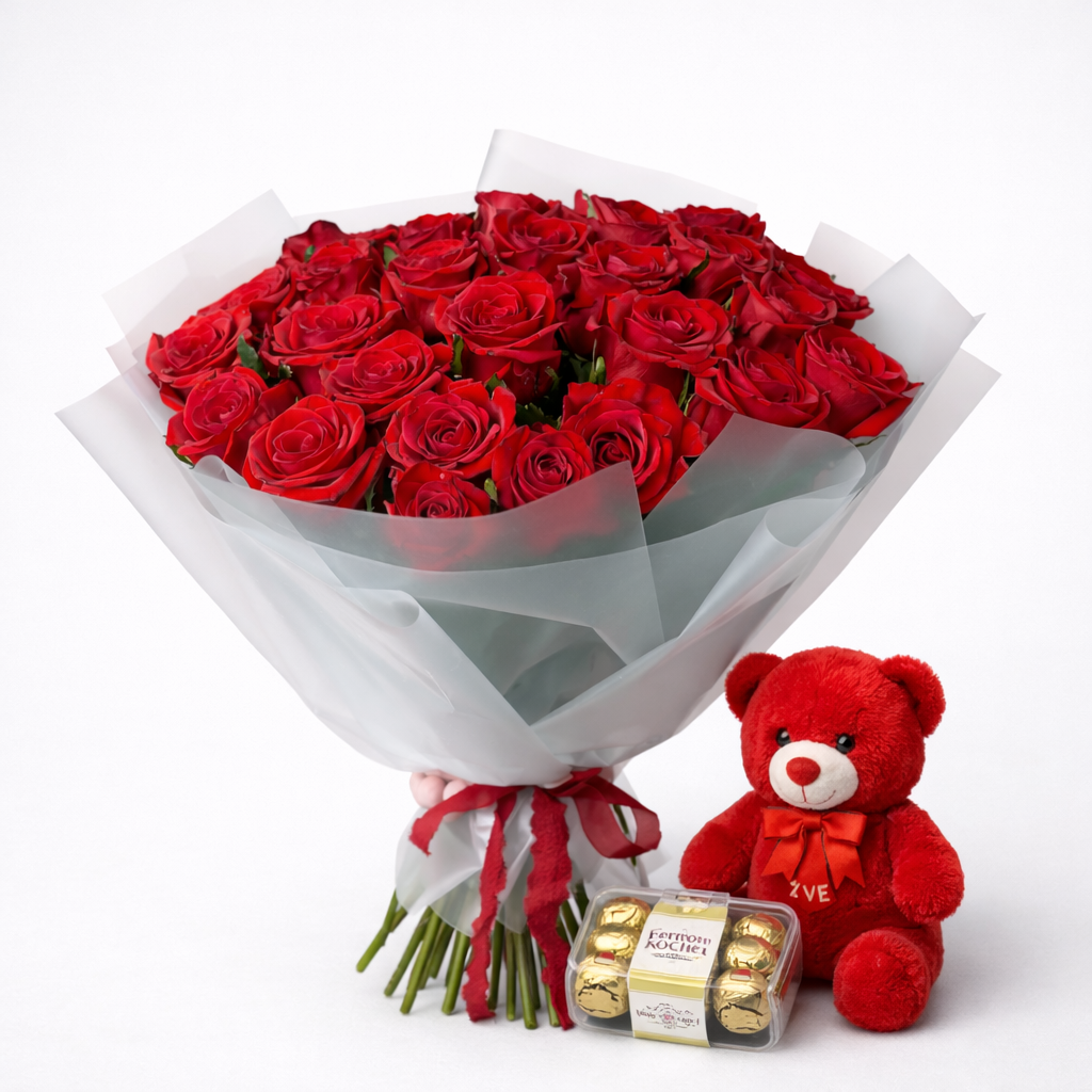 25 Red Roses with Ferrero Chocolate Box