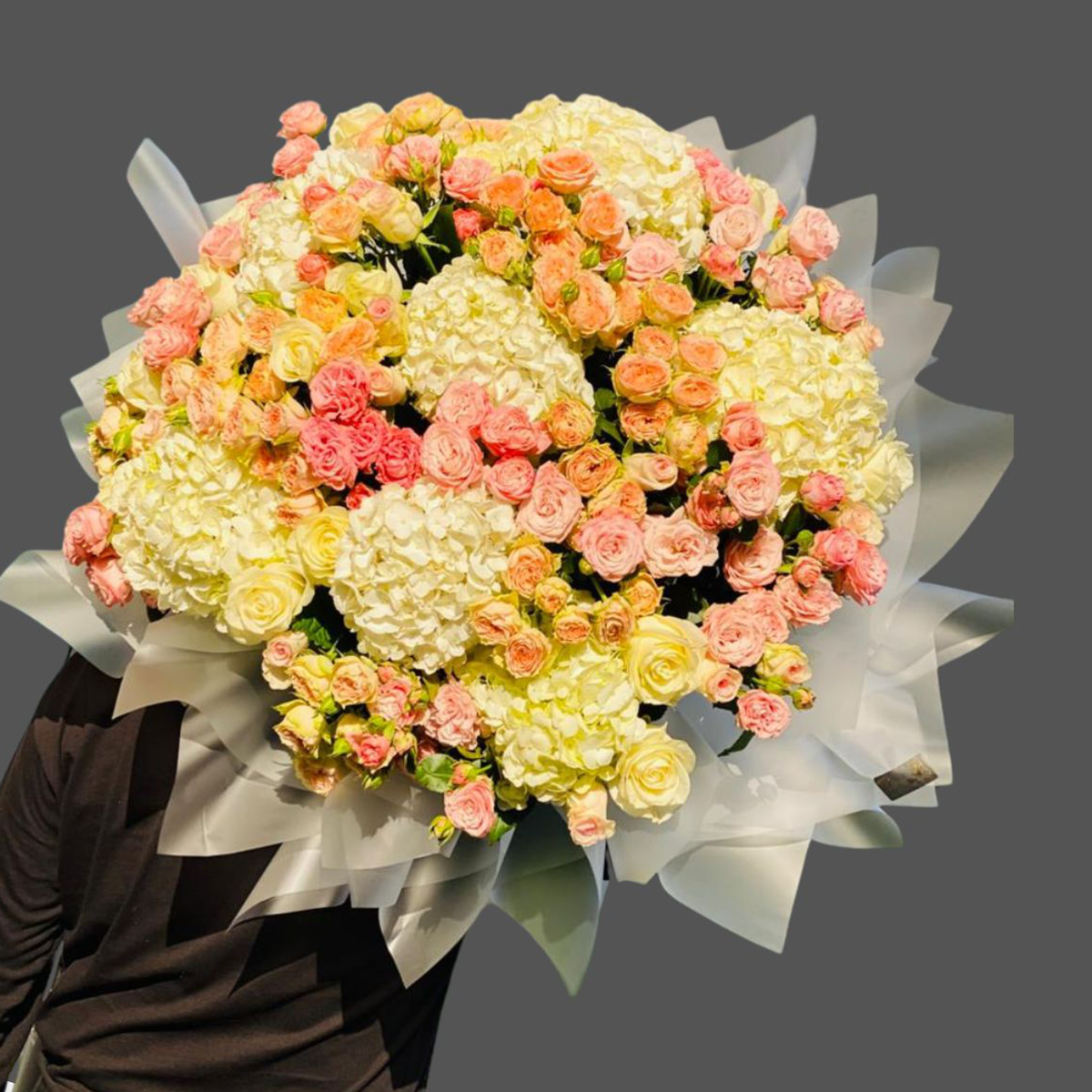 Immerse yourself into the enchanting beauty of this exquisite bouquet from our Florists Specials. Carefully crafted with 7 stunning Hydrangeas, punctuated by 26 bombastic Silva spray roses, this array of fresh, captivating flowers invokes a feeling of elegance. An addition of 18 alluring roses effortlessly elevates the bouquet to a new level of sophistication. This floral arrangement is truly a feast for the eyes, making it an ideal gift for a special someone or a dramatic centerpiece for your home decor.