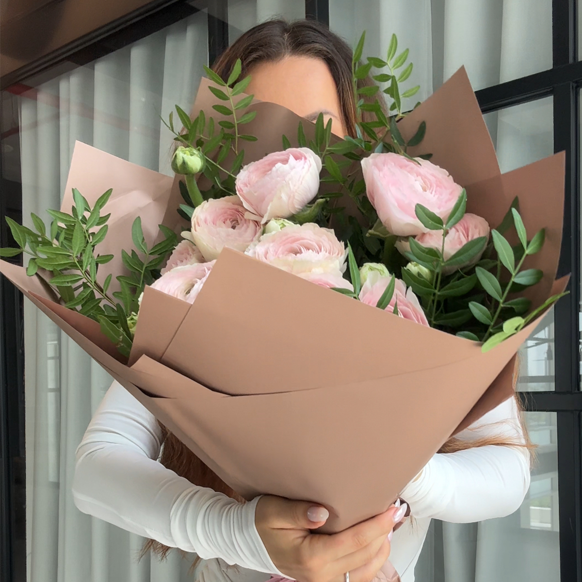 Ranuculus Blooming peach combined with pistacia leaves in beautiful charms premium wrapping bouquet.